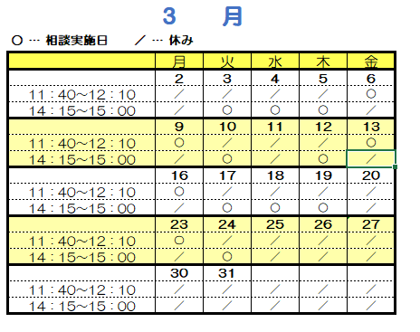 3月のスケジュールを1階正面入り口、4階西病棟掲示板、3階院内学級入り口にも掲示しています。相談の際は、表内の時間に直接院内学級へお越しください。