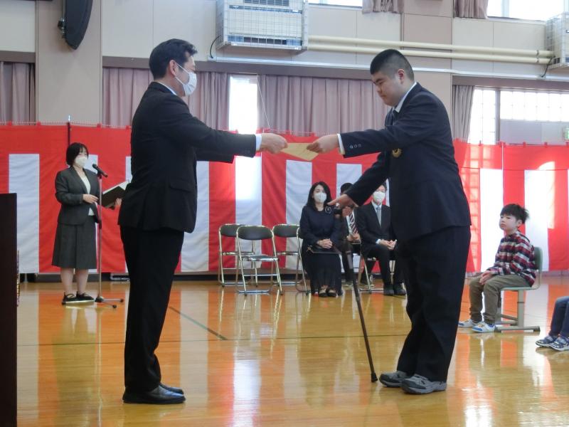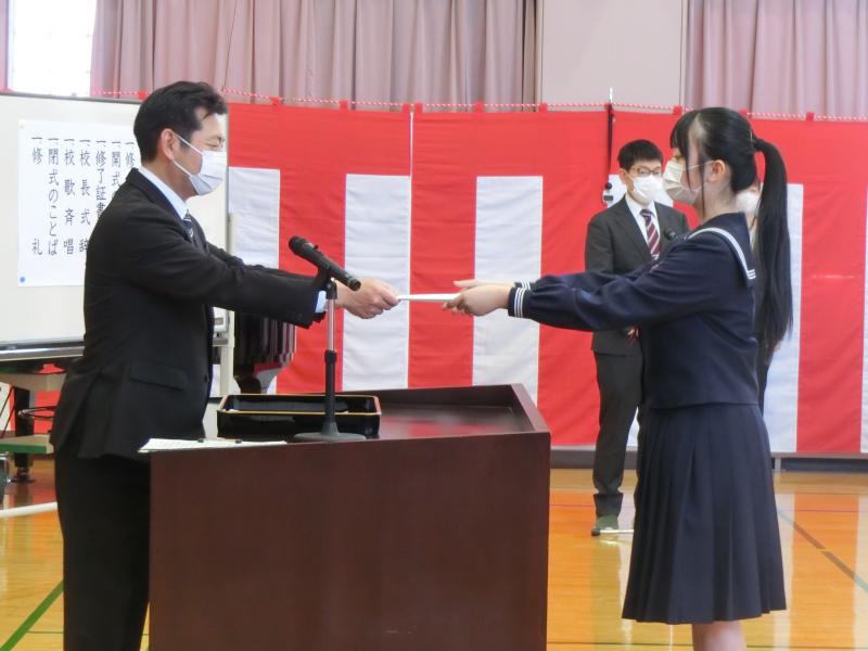 3月25日(水)、修了式が行われました。修了生が名前を呼ばれ、代表児童生徒が校長先生から修了証書を受け取りました。修了式の後には表彰が行われ、大きな拍手をもらいました。
