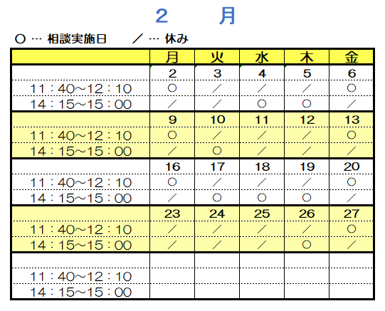 2月のスケジュールを1階正面入り口、4階西病棟掲示板、3階院内学級入り口にも掲示しています。相談の際は、表内の時間に直接院内学級へお越しください。